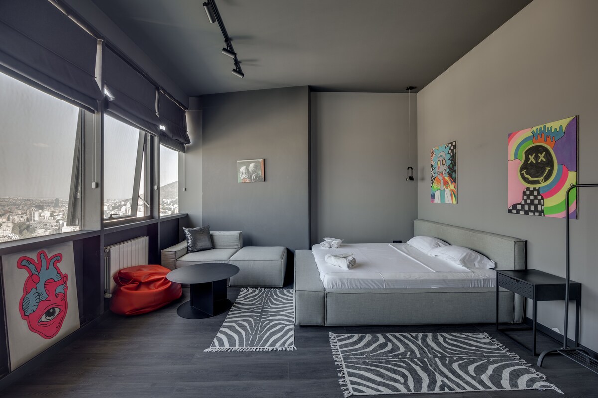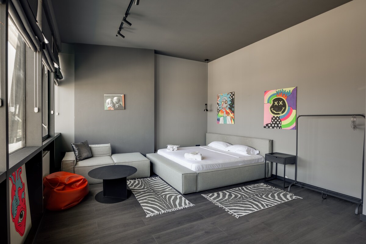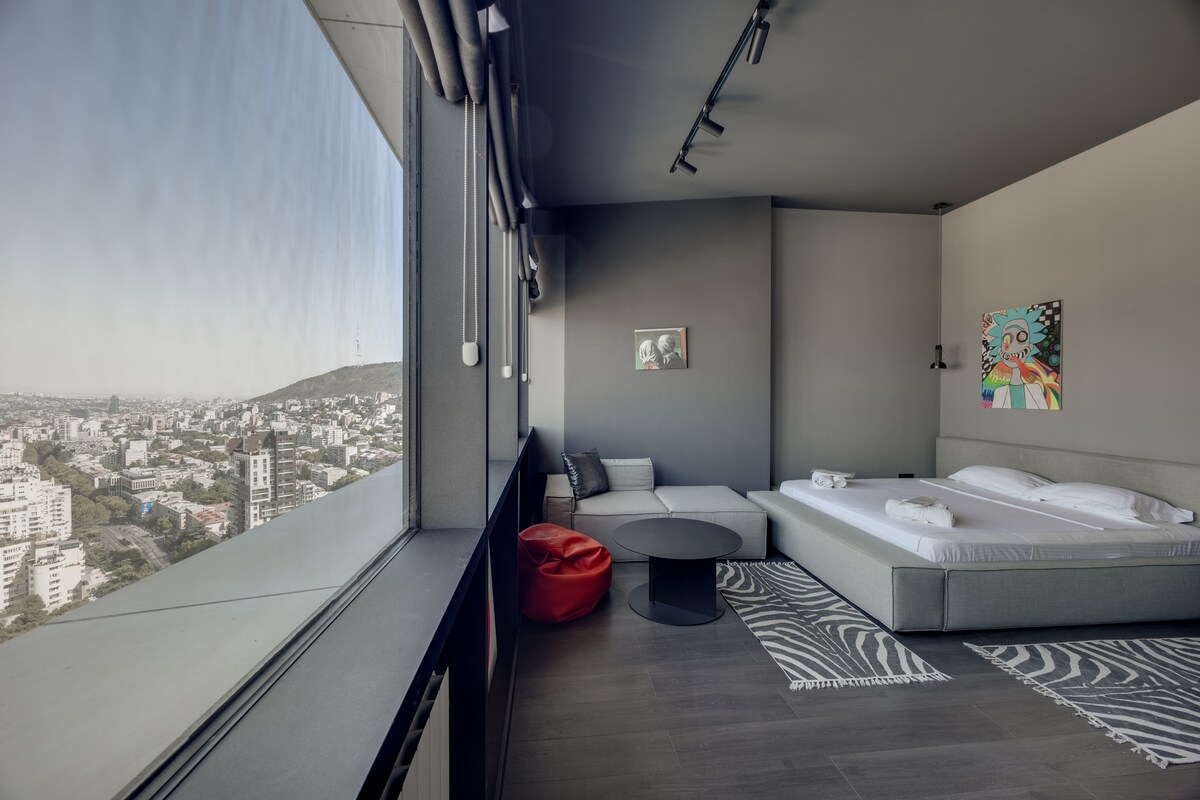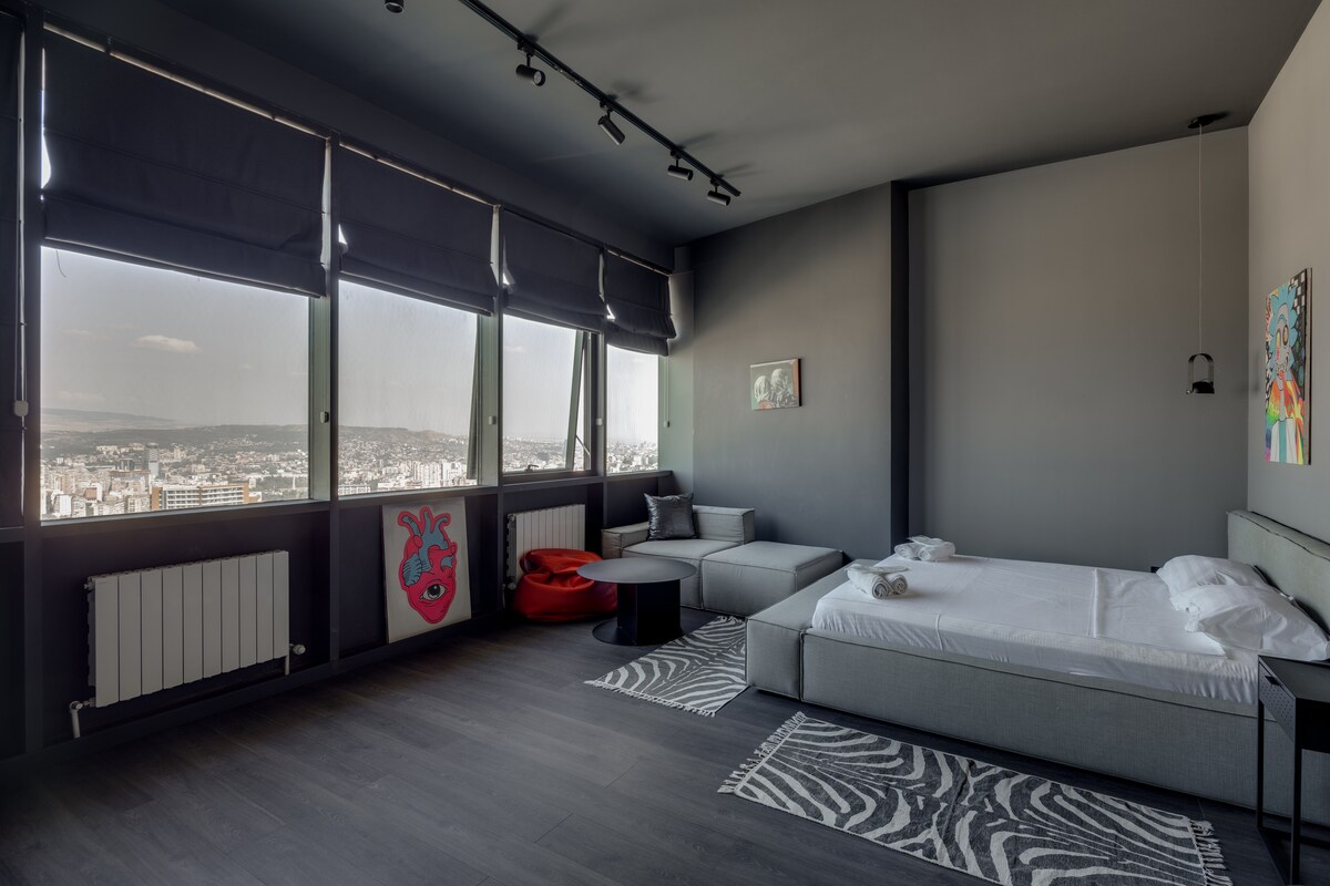 The apartment is on the 28th floor with panoramic windows and a chic view of the whole city and the mountains. The apartment perfectly fits for business visits. It’s located right next to the Axis Business center, as well as hotels Hilton Garden and Pullman, where you can find spaces for business meetings. Numerous restaurants and bars are located in this neighborhood. Axis Towers Shopping Center is one of the most prominent areas located at the -1 floor of the tower. Guests will meet various shopping brands from different sectors, such as gift shops, domestic products, office or digital technics and others.