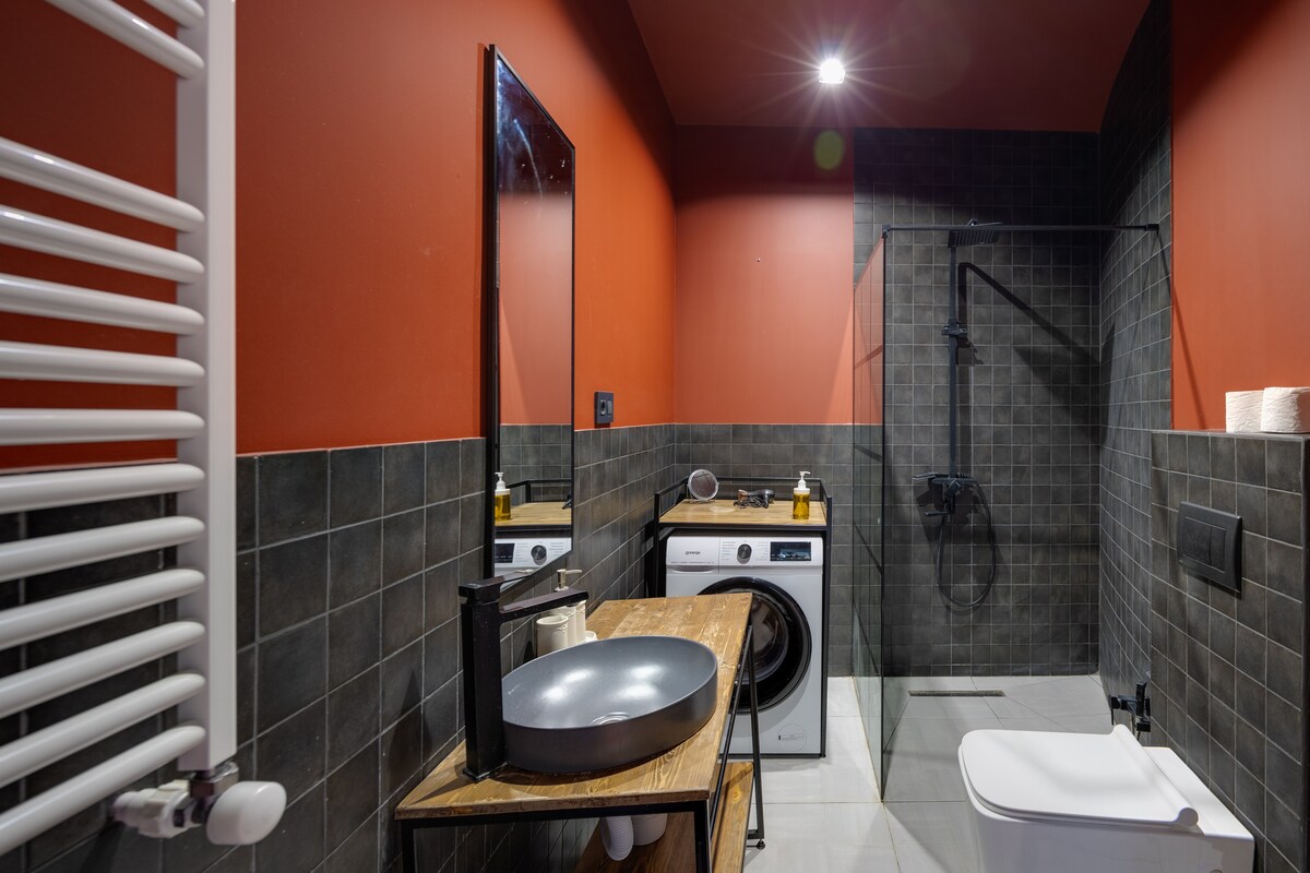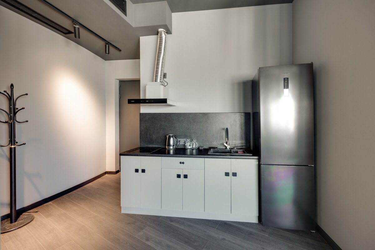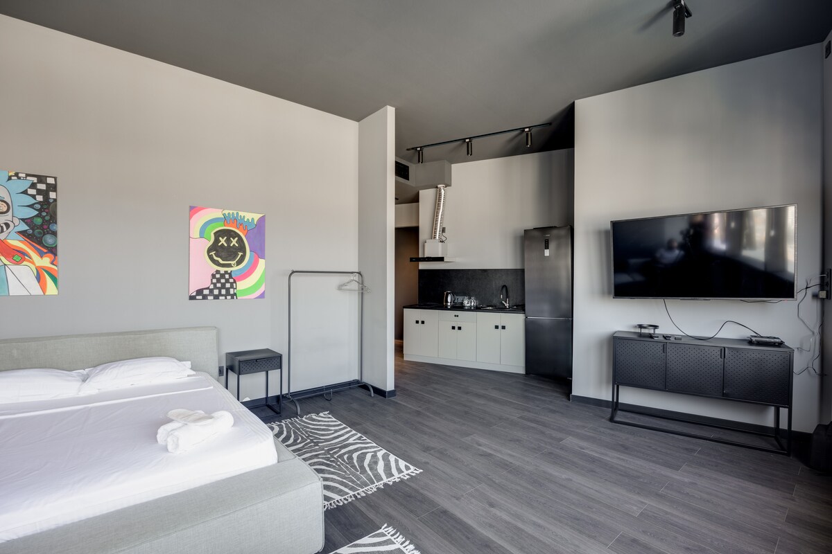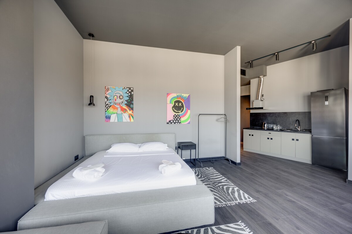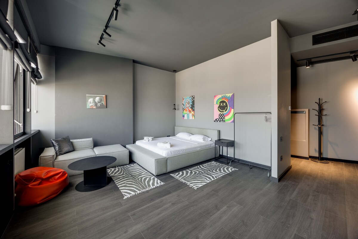 The apartment is on the 28th floor with panoramic windows and a chic view of the whole city and the mountains. The apartment perfectly fits for business visits. It’s located right next to the Axis Business center, as well as hotels Hilton Garden and Pullman, where you can find spaces for business meetings. Numerous restaurants and bars are located in this neighborhood. Axis Towers Shopping Center is one of the most prominent areas located at the -1 floor of the tower. Guests will meet various shopping brands from different sectors, such as gift shops, domestic products, office or digital technics and others.