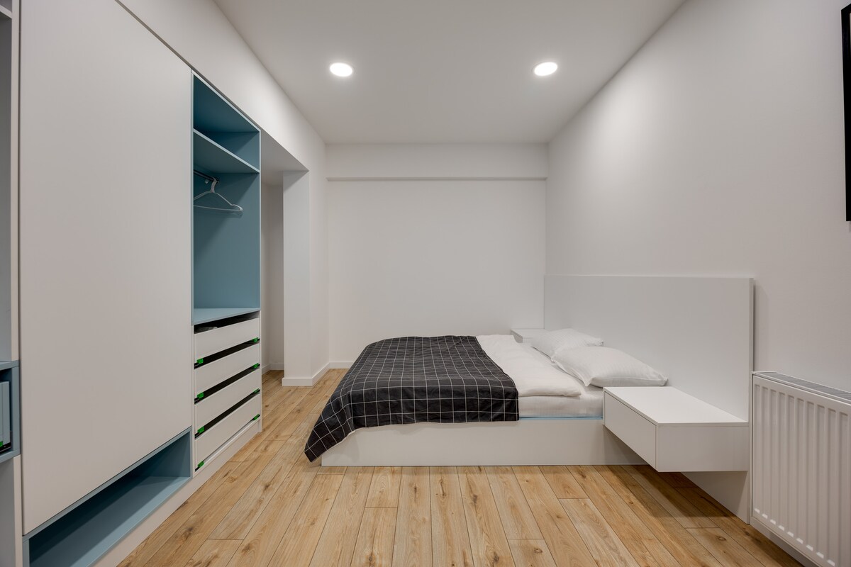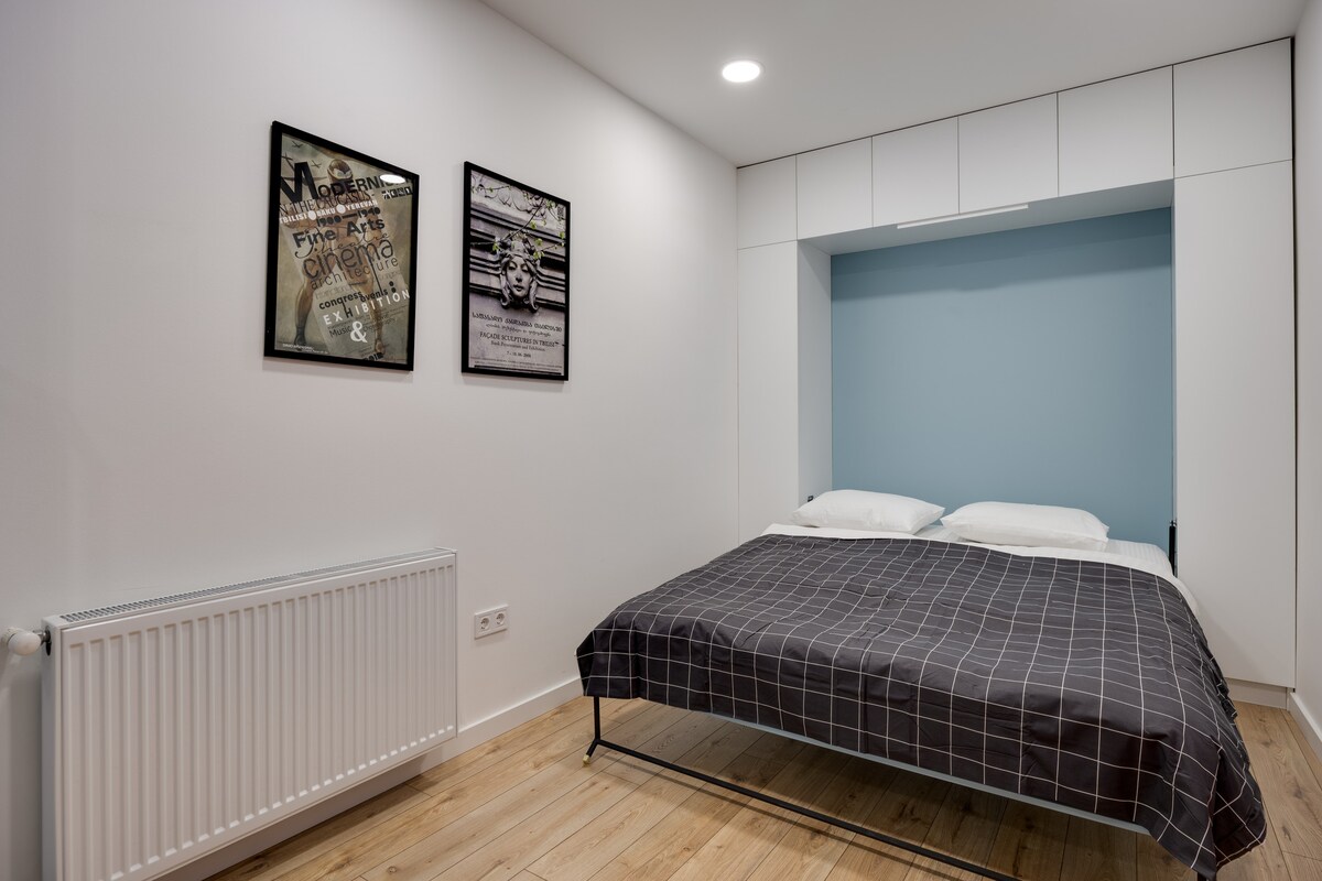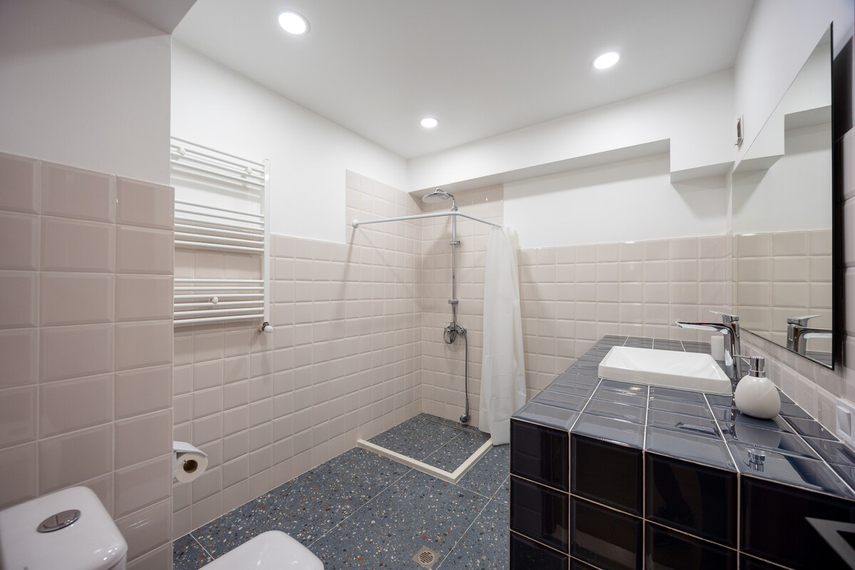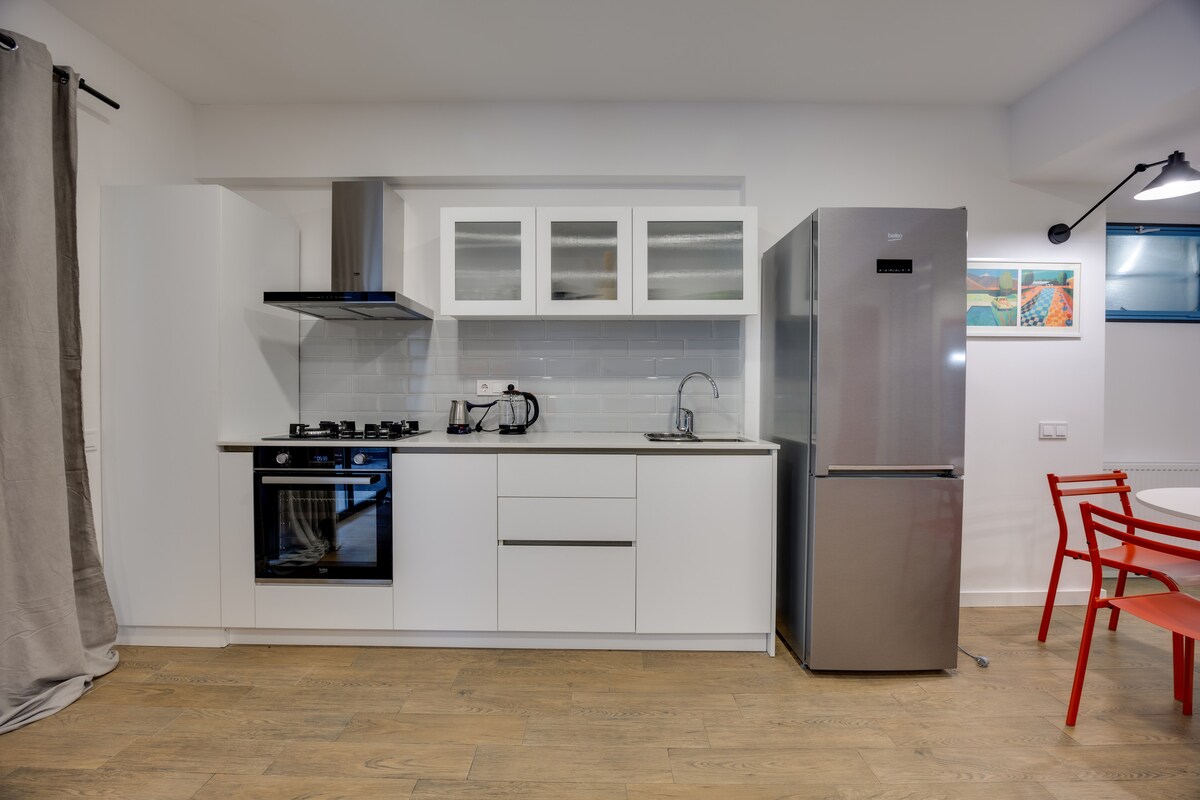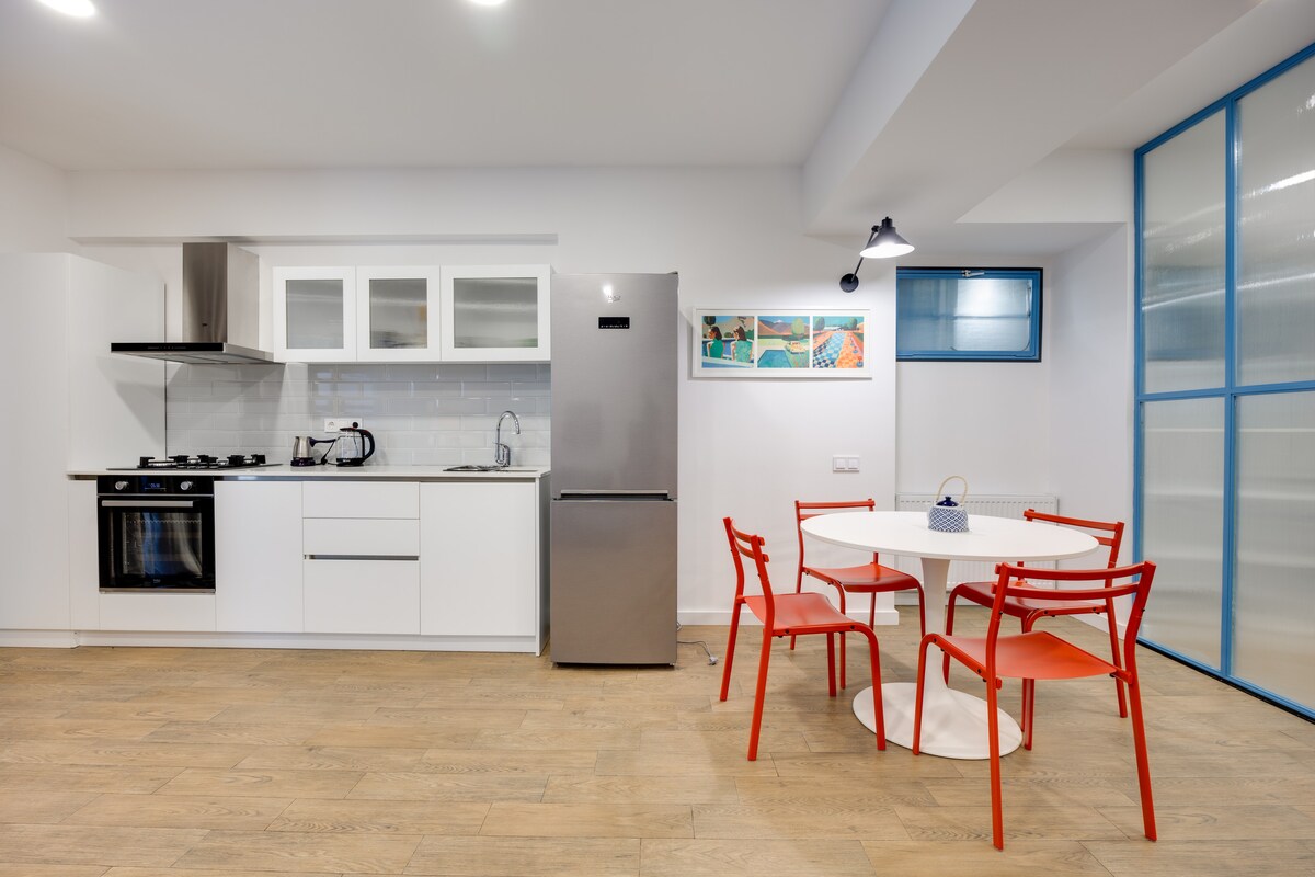 The spaceApartment is equipped with free WiFi, A/C, central heating system, flat-screen TV, washing machine, hairdryer, and all necessary kitchenware.