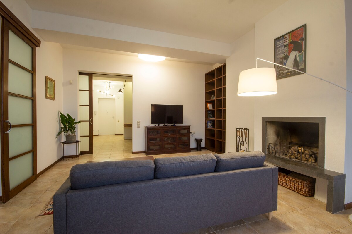 Well furnished living room with sofa and flat screen TV and Fireplace.