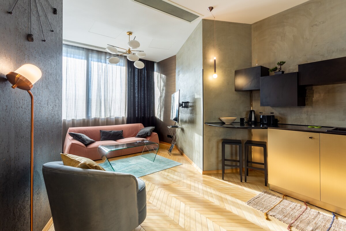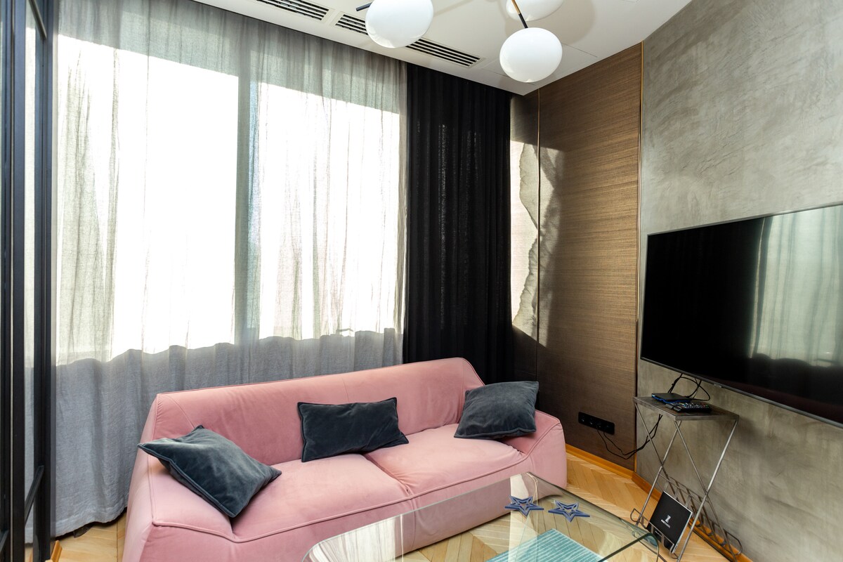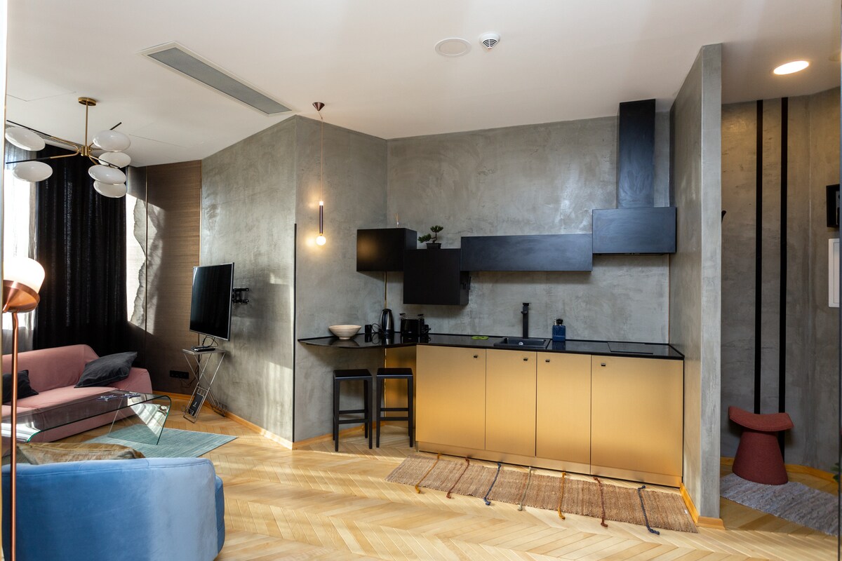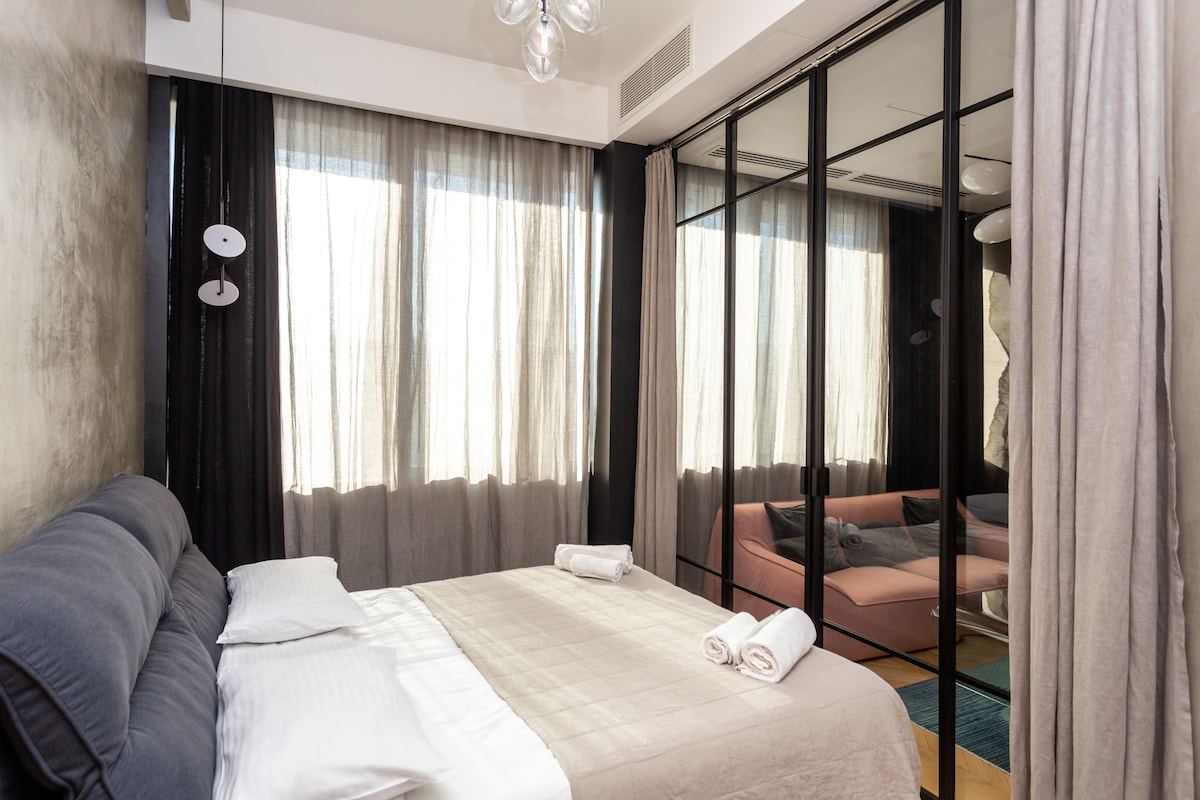 The apartment perfectly fits for business visits. It’s located in the city center close to Axis Business center, where you can find spaces for business meetings. Numerous restaurants and bars are located in this neighborhood.