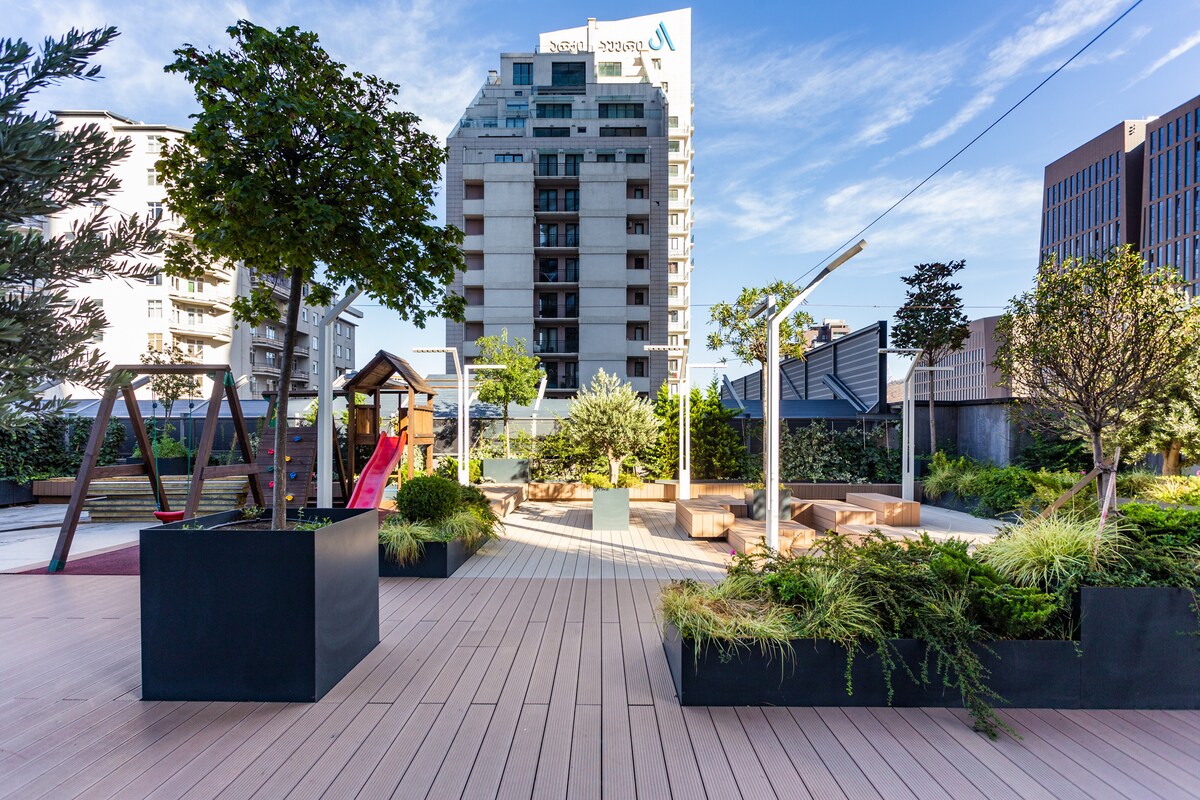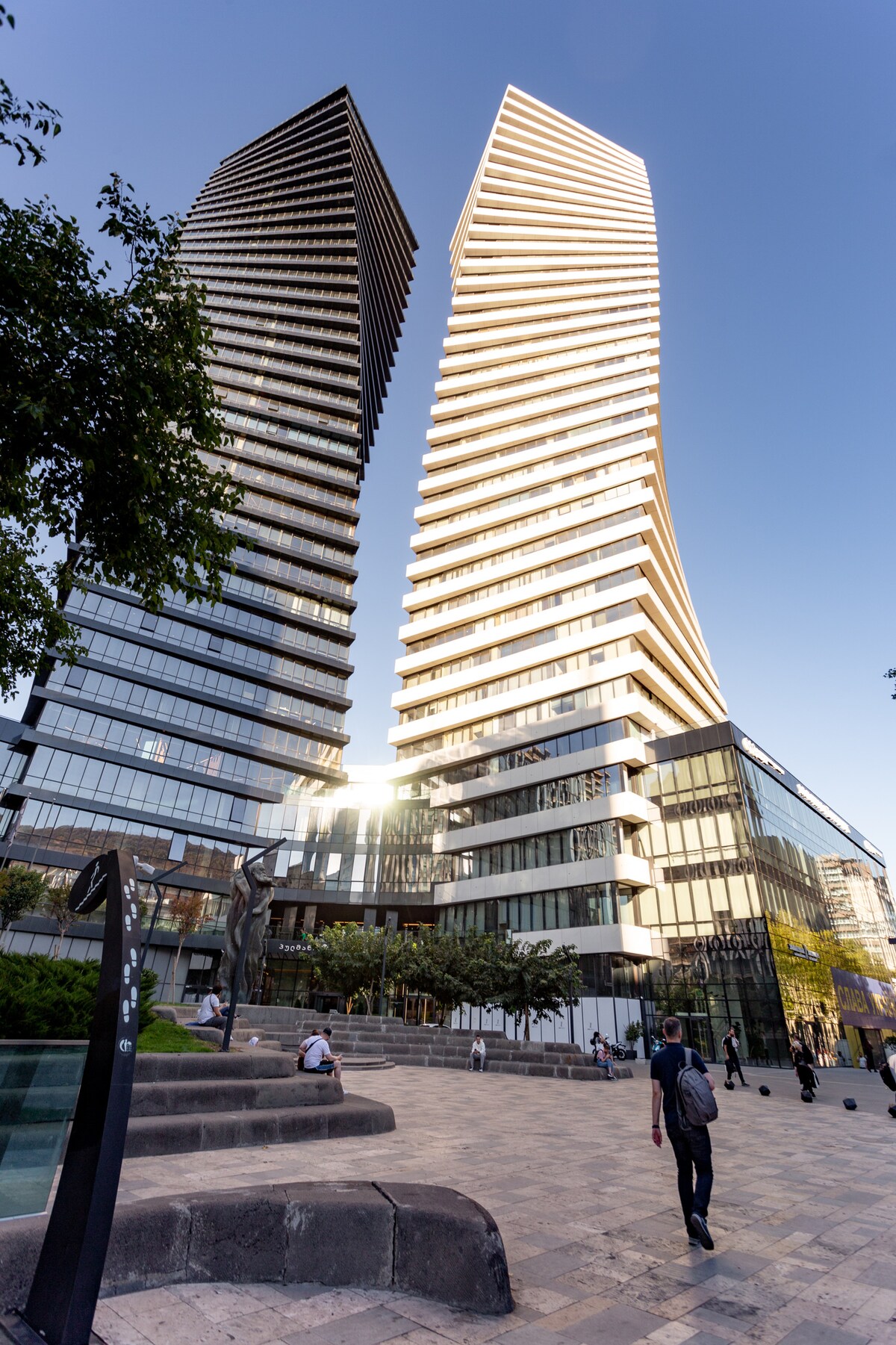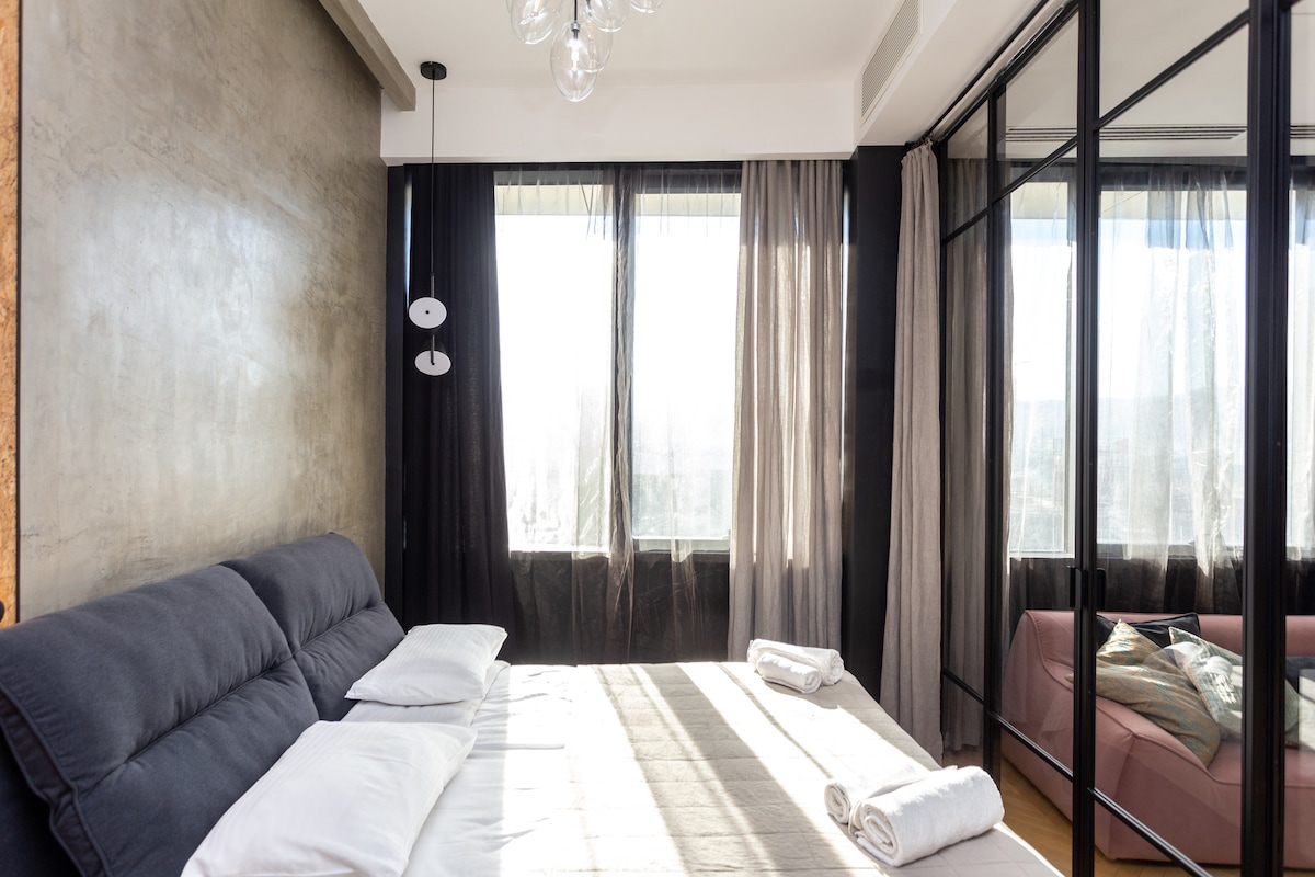 This apartment is in a new building on the 19th floor with panoramic windows and a chic view of the whole city and the mountains. Axis Towers complex is located in the most elite area, in the heart of modern life of Tbilisi: close to the best supermarkets, many restaurants, Park, public transport stop.