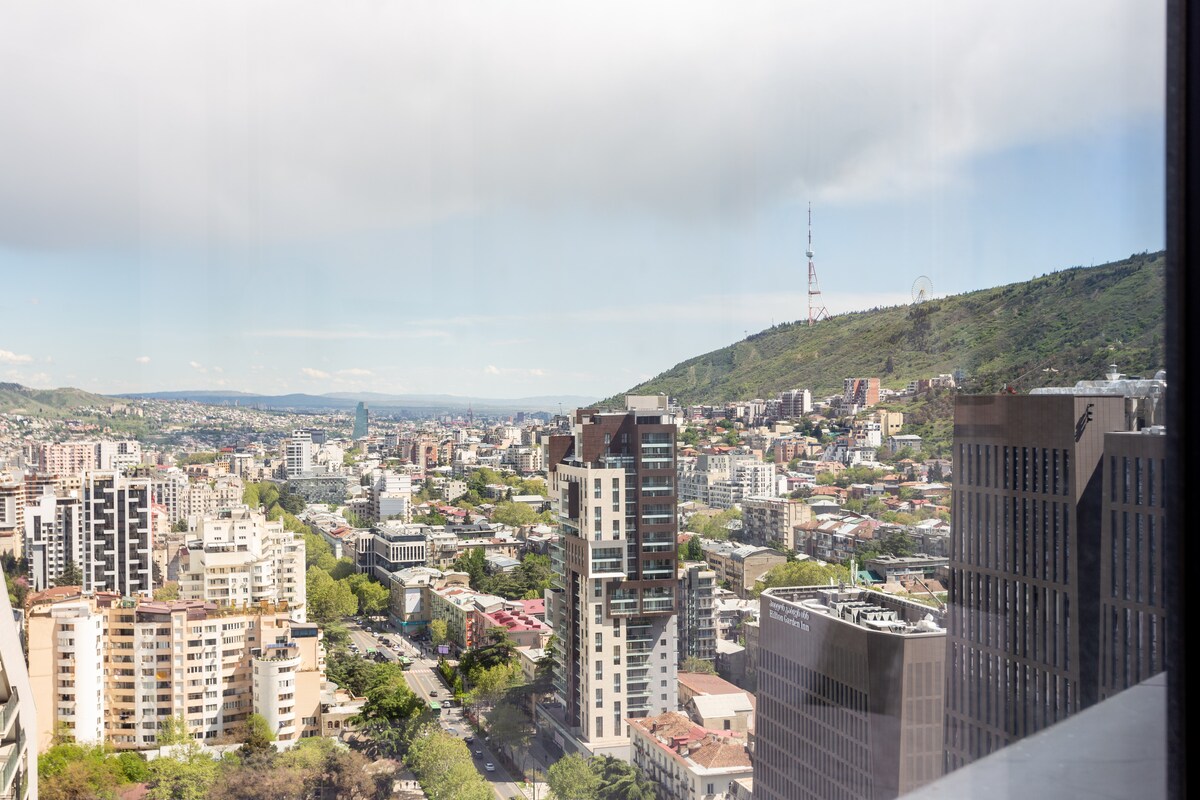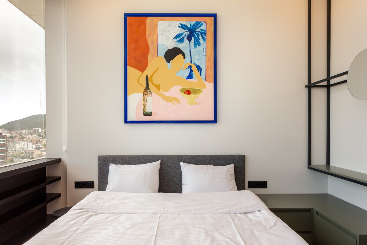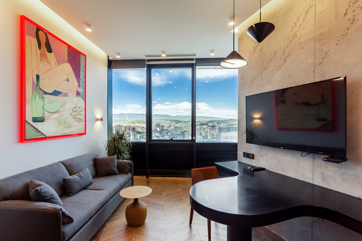 The apartment is on the 23rd floor with panoramic windows and a chic view of the whole city and the mountains. The apartment perfectly fits for business visits. It’s located right next to the Axis Business center, as well as hotels Hilton Garden and Pullman, where you can find spaces for business meetings. Numerous restaurants and bars are located in this neighborhood. Axis Towers Shopping Center is one of the most prominent areas located at the -1 floor of the tower. Guests will meet various shopping brands from different sectors, such as gift shops, domestic products, office or digital technics and others.