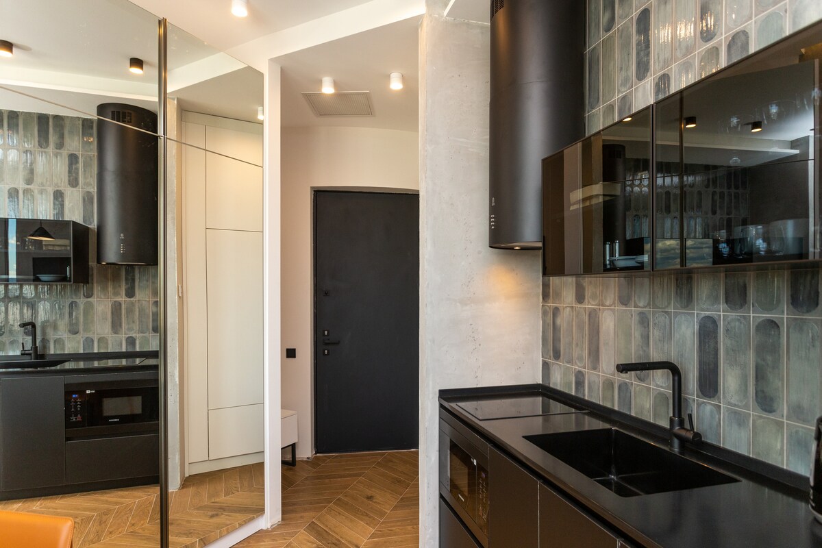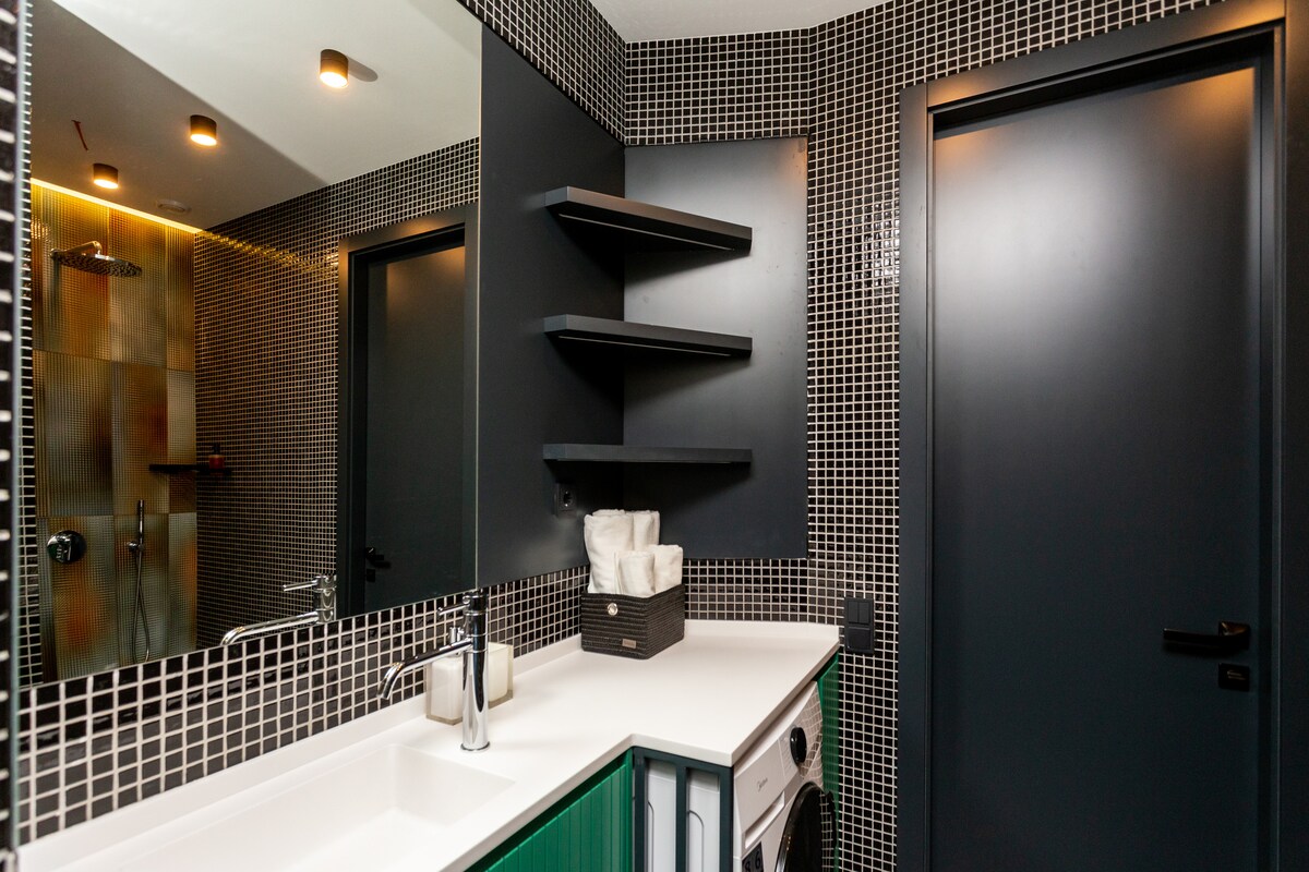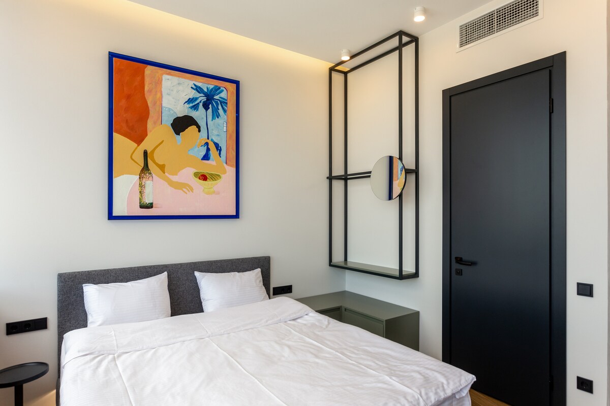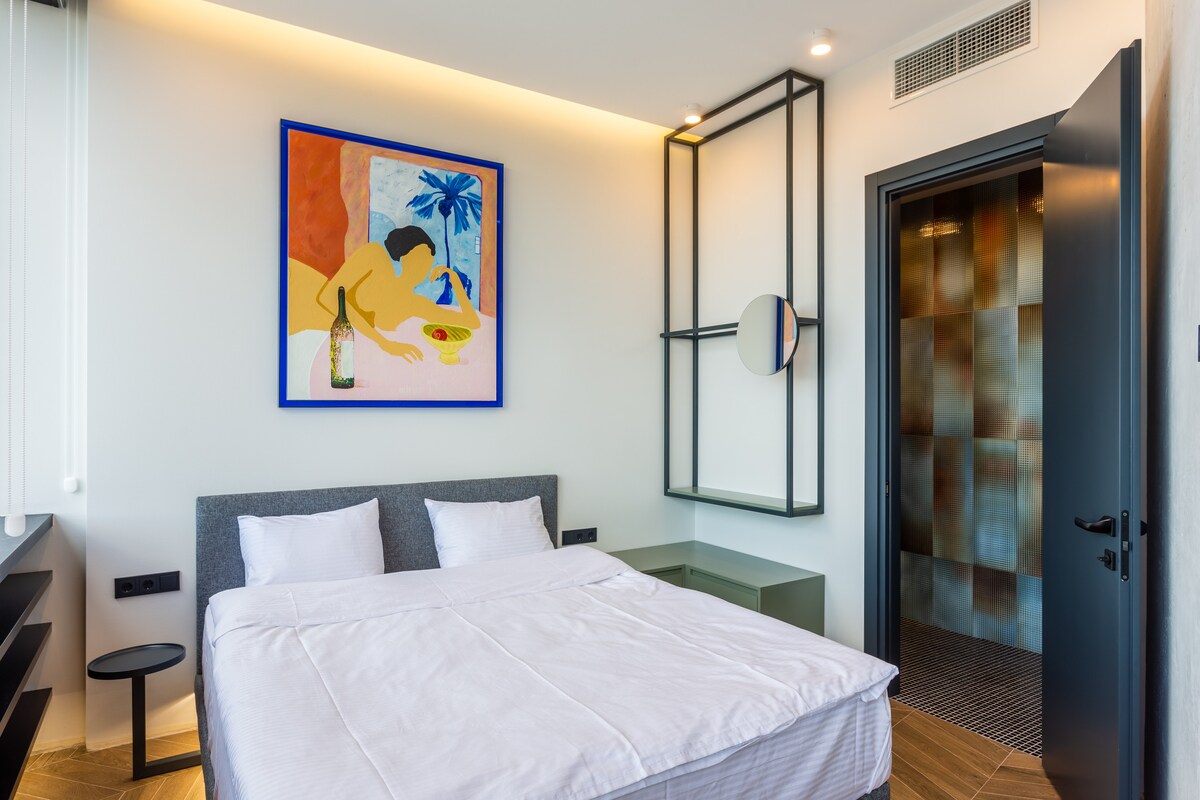 The apartment is on the 23rd floor with panoramic windows and a chic view of the whole city and the mountains. The apartment perfectly fits for business visits. It’s located right next to the Axis Business center, as well as hotels Hilton Garden and Pullman, where you can find spaces for business meetings. Numerous restaurants and bars are located in this neighborhood. Axis Towers Shopping Center is one of the most prominent areas located at the -1 floor of the tower. Guests will meet various shopping brands from different sectors, such as gift shops, domestic products, office or digital technics and others.